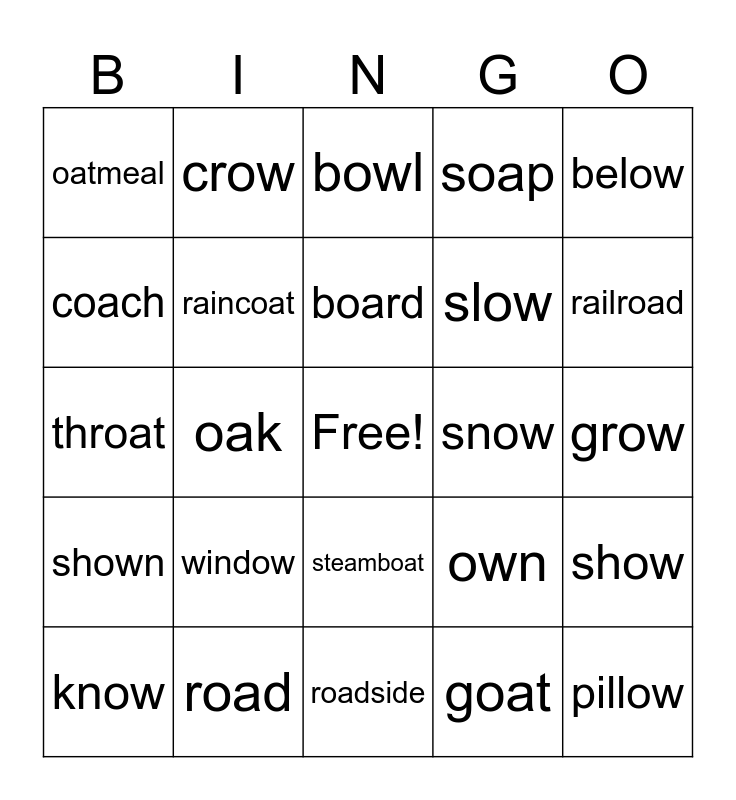 This bingo card has a free space and 24 words: window, road, board, know, below, oatmeal, coach, crow, snow, steamboat, slow, throat, own, show, raincoat, goat, grow, bowl, railroad, oak, pillow, shown, soap and roadside.