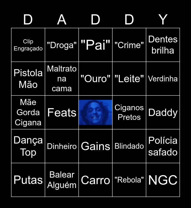 This bingo card has a free space and 44 words: é o dére, NGC, "Choppa", Putas, "Puta Safada", "Rebola", "Pai", "Gozo"/"Goza", Dentes brilha, Balear Alguém, "Crime", Ciganos Pretos, Gains, Dinheiro, "Grife", Carro, MAMADA, Mãe Gorda Cigana, "10 mil", Verdinha, "Droga", "Marola", Voz sexy, Clip Engraçado, Régua, Daddy, M4, Favela, Blindado, Dança Top, Dança Sexual, Polícia safado, +1 corrente, Bunda Gorda, Feats, "Bunda Gostosa", "Piroca", "bozeta", "Ouro", Pistola Mão, "Leite", LaCroste, Maltrato na cama and Malote.