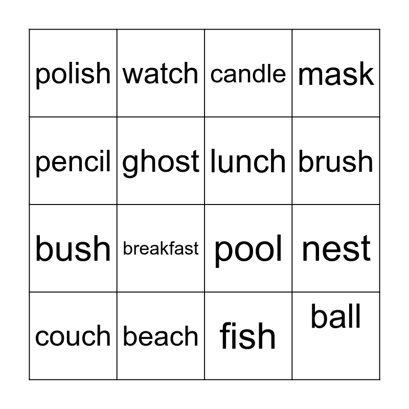 This bingo card has 16 words: beach, nest, candle, polish, bush, watch, pool, fish, pencil, ghost, couch, mask, breakfast, brush, lunch and ball.