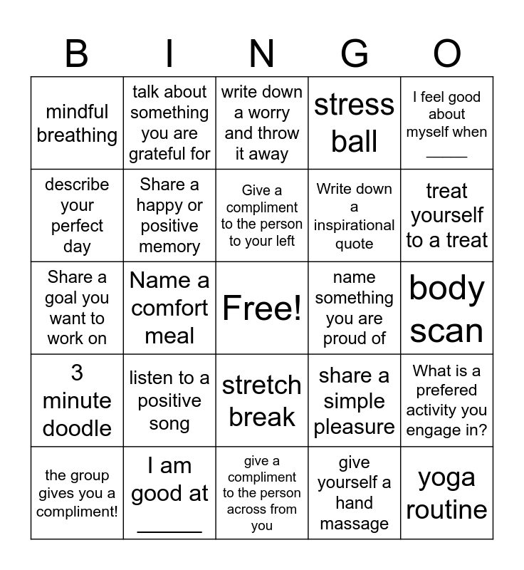 This bingo card has a free space and 24 words: listen to a positive song, I am good at _____, Give a compliment to the person to your left, the group gives you a compliment!, I feel good about myself when _____, mindful breathing, describe your perfect day, talk about something you are grateful for, name something you are proud of, stretch break, Write down a inspirational quote, Share a goal you want to work on, share a simple pleasure, What is a prefered activity you engage in?, Share a happy or positive memory, give yourself a hand massage, body scan, write down a worry and throw it away, treat yourself to a treat, Name a comfort meal, yoga routine, 3 minute doodle, stress ball and give a compliment to the person across from you.