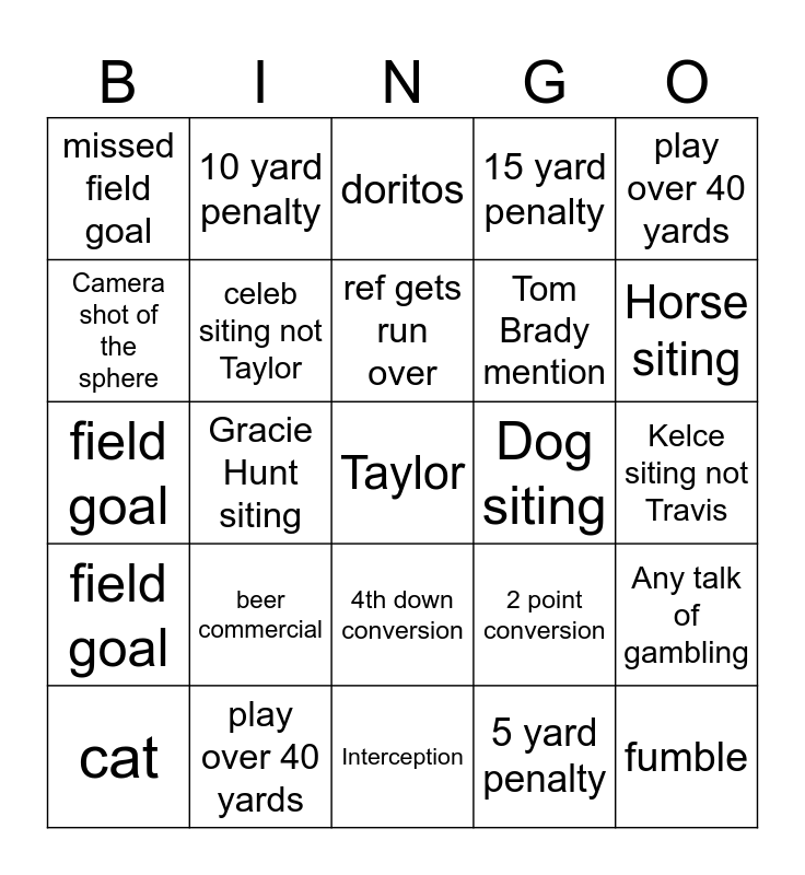 This bingo card has a free space and 34 words: the word Swiftee, 5 yard penalty, doritos, credit card commercial, field goal, celeb siting not Taylor, play over 40 yards, cat, 10 yard penalty, the word swiftee, ref gets run over, doritos, Car commercial, movie commercial, Dog siting, Horse siting, play over 40 yards, field goal, beer commercial, 2 point conversion, 4th down conversion, Call reversed, missed field goal, Kelce siting not Travis, Interception, fumble, 15 yard penalty, End zone dance, Tom Brady mention, Camera shot of the sphere, QB sack, Gracie Hunt siting, Any talk of gambling and internet commercial.