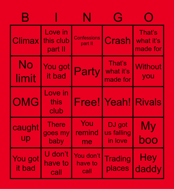 This bingo card has a free space and 24 words: There goes my baby, U don’t have to call, Party, You got it bad, That’s what it’s made for, Climax, No limit, Love in this club part II, Yeah!, You remind me, That’s what it’s made for, OMG, DJ got us falling in love, My boo, You got it bad, Trading places, Rivals, Confessions part II, Without you, Love in this club, Hey daddy, caught up, Crash and You don’t have to call.