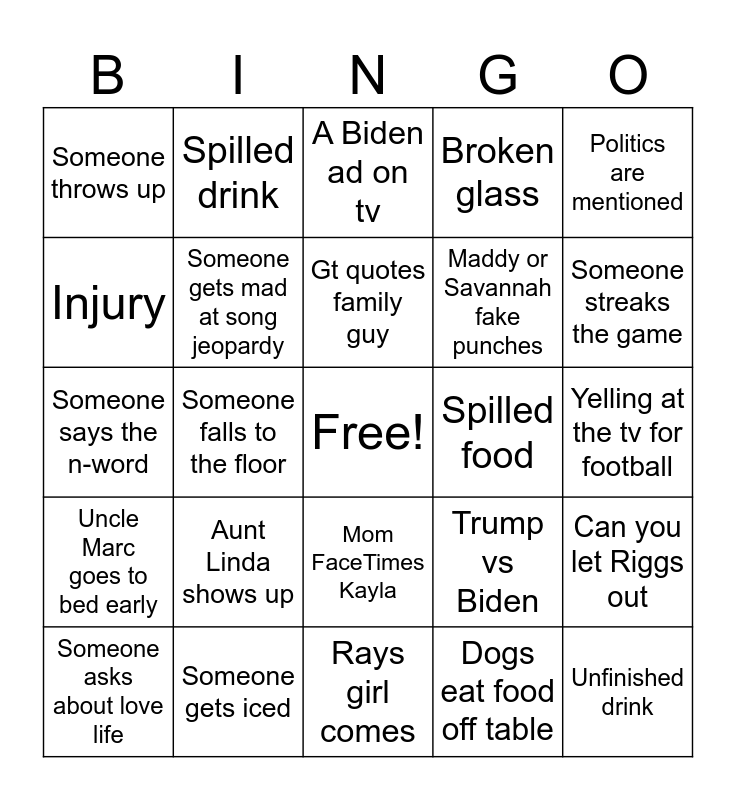 This bingo card has a free space and 24 words: Aunt Linda shows up, Someone gets iced, Gt quotes family guy, Someone asks about love life, Politics are mentioned, Someone throws up, Injury, Spilled drink, Spilled food, Mom FaceTimes Kayla, Maddy or Savannah fake punches, Someone says the n-word, Trump vs Biden, Can you let Riggs out, Someone gets mad at song jeopardy, Dogs eat food off table, Yelling at the tv for football, A Biden ad on tv, Someone streaks the game, Someone falls to the floor, Unfinished drink, Uncle Marc goes to bed early, Broken glass and Rays girl comes.