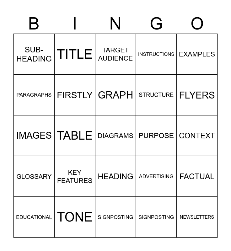 This bingo card has 30 words: TONE, NEUTRAL, TABLE, INFORMATIVE, SUB-HEADING, TARGET AUDIENCE, FIRSTLY, HEADING, PURPOSE, SIGNPOSTING, CONTEXT, DIAGRAMS, SIGNPOSTING, NEWSLETTERS, FLYERS, ANNOTATION, ADVERTISING, GLOSSARY, KEY FEATURES, EXAMPLES, IMAGES, EXPLANATION, TITLE, STRUCTURE, PARAGRAPHS, INSTRUCTIONS, FACTUAL, EDUCATIONAL, GRAPH and REPORT.
