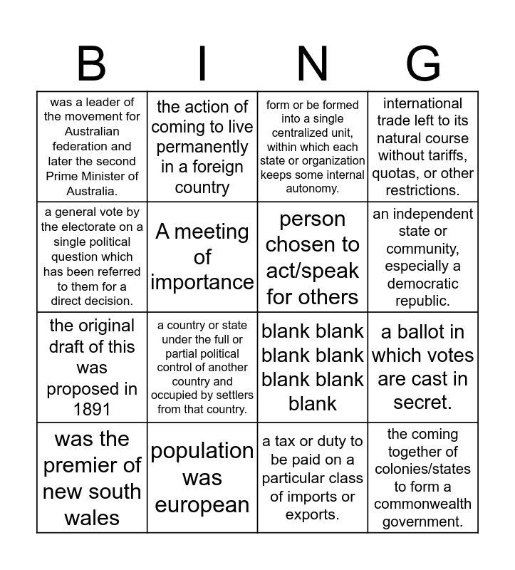 This bingo card has a free space and 15 words: was the premier of new south wales, the coming together of colonies/states to form a commonwealth government., form or be formed into a single centralized unit, within which each state or organization keeps some internal autonomy., was a leader of the movement for Australian federation and later the second Prime Minister of Australia., an independent state or community, especially a democratic republic., a general vote by the electorate on a single political question which has been referred to them for a direct decision., a country or state under the full or partial political control of another country and occupied by settlers from that country., a tax or duty to be paid on a particular class of imports or exports., A meeting of importance, the original draft of this was proposed in 1891, a ballot in which votes are cast in secret., international trade left to its natural course without tariffs, quotas, or other restrictions., person chosen to act/speak for others, the action of coming to live permanently in a foreign country and population was european.
