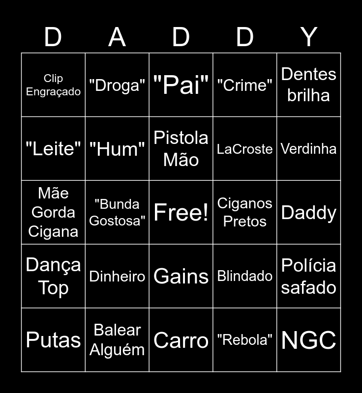 This bingo card has a free space and 45 words: é o dére, NGC, "Choppa", Putas, "Puta Safada", "Rebola", "Pai", "Gozo"/"Goza", Dentes brilha, Balear Alguém, "Crime", Ciganos Pretos, Gains, Dinheiro, "Grife", Carro, MAMADA, Mãe Gorda Cigana, "10 mil", Verdinha, "Droga", "Marola", Voz sexy, Clip Engraçado, Régua, Daddy, M4, Favela, Blindado, Dança Top, Dança Sexual, Polícia safado, +1 corrente, Bunda Gorda, Feats, "Bunda Gostosa", "Piroca", "bozeta", "Ouro", Pistola Mão, "Leite", LaCroste, Malote, "Hum" and Whiskey.