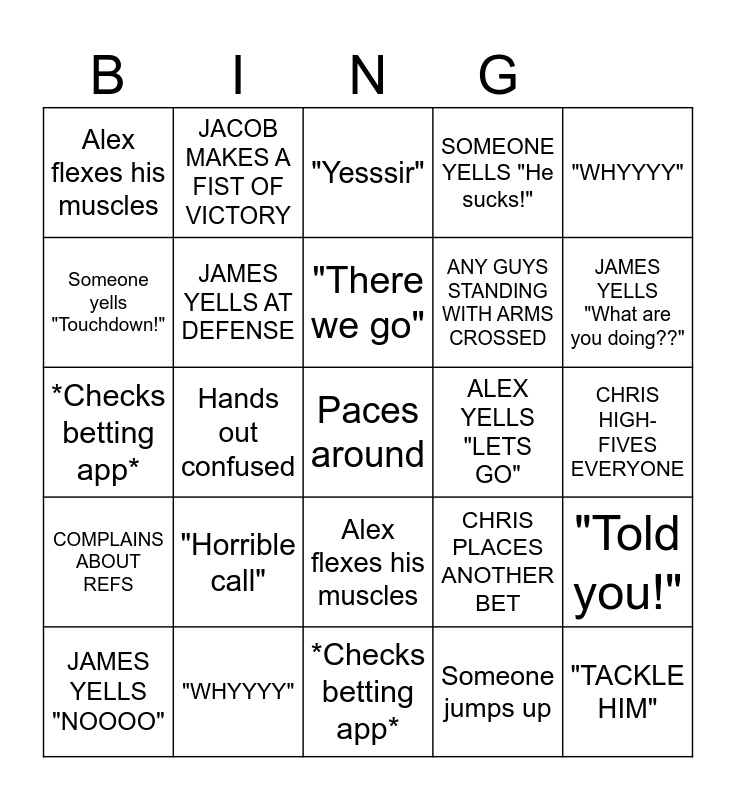 This bingo card has 65 words: JAMES YELLS AT DEFENSE, ALEX YELLS "LETS GO", ALEX PLACES ANOTHER BET, CHRIS PLACES ANOTHER BET, CHRIS HIGH-FIVES EVERYONE, JACOB PUTS HANDS ON HEAD, JACOB MAKES A FIST OF VICTORY, JAMES YELLS "NOOOO", ANY GUYS STANDING WITH ARMS CROSSED, ANDY SAYS "Whaaaat" AND LOOKS AROUND, COMPLAINS ABOUT REFS, JAMES YELLS "What are you doing??", Free!, SOMEONE YELLS "He sucks!", Someone yells "Touchdown!", Alex flexes his muscles, Hands out confused, "Yesssir", "You gotta catch that", "WHYYYY", *Checks betting app*, "Horrible call", Paces around, Face palm, JAMES YELLS AT DEFENSE, ALEX PLACES ANOTHER BET, CHRIS PLACES ANOTHER BET, CHRIS HIGH-FIVES EVERYONE, ALEX YELLS "LETS GO", JACOB MAKES A FIST OF VICTORY, JAMES YELLS "NOOOO", ANY GUYS STANDING WITH ARMS CROSSED, JACOB PUTS HANDS ON HEAD, COMPLAINS ABOUT REFS, JAMES YELLS "What are you doing??", SOMEONE YELLS "He sucks!", ANDY SAYS "Whaaaat" AND LOOKS AROUND, Alex flexes his muscles, Hands out confused, "Yesssir", Someone yells "Touchdown!", "WHYYYY", *Checks betting app*, "Horrible call", "You gotta catch that", Face palm, JAMES YELLS AT DEFENSE, Andy goes back for more food, Paces around, "Told you!", "We needed that", Complains about ref, "Go! Go! Go!", Someone jumps up, Calls flag before ref, Leans forward on elbows, "Third down", "There we go", "You're gonna like that", "TACKLE HIM", "Wowww what a pass", Any of guys happy dance, Flag gesture, "1st down" and "You gotta catch that".