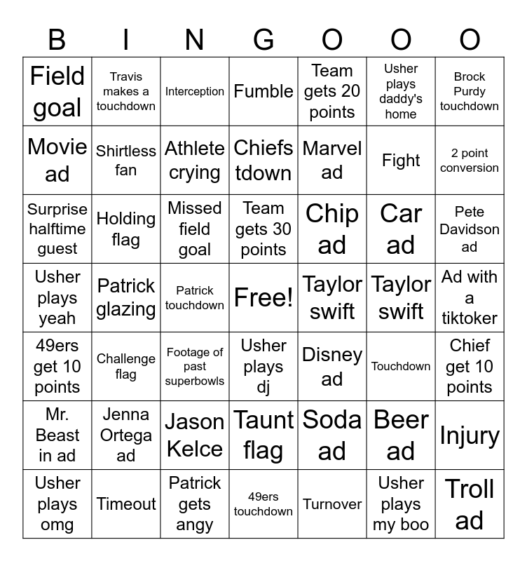 This bingo card has a free space and 48 words: Soda ad, Fight, 49ers touchdown, Patrick glazing, Missed field goal, Ad with a tiktoker, Travis makes a touchdown, Timeout, Usher plays daddy's home, Usher plays dj, Brock Purdy touchdown, Fumble, Car ad, Chip ad, Mr. Beast in ad, Taylor swift, Movie ad, 2 point conversion, Beer ad, Team gets 20 points, Marvel ad, Patrick touchdown, Field goal, Shirtless fan, Injury, Athlete crying, Pete Davidson ad, Usher plays omg, Team gets 30 points, Holding flag, Usher plays my boo, Taylor swift, Chief get 10 points, Jenna Ortega ad, Usher plays yeah, Disney ad, Touchdown, Surprise halftime guest, Footage of past superbowls, Jason Kelce, 49ers get 10 points, Troll ad, Interception, Patrick gets angy, Chiefs tdown, Taunt flag, Challenge flag and Turnover.