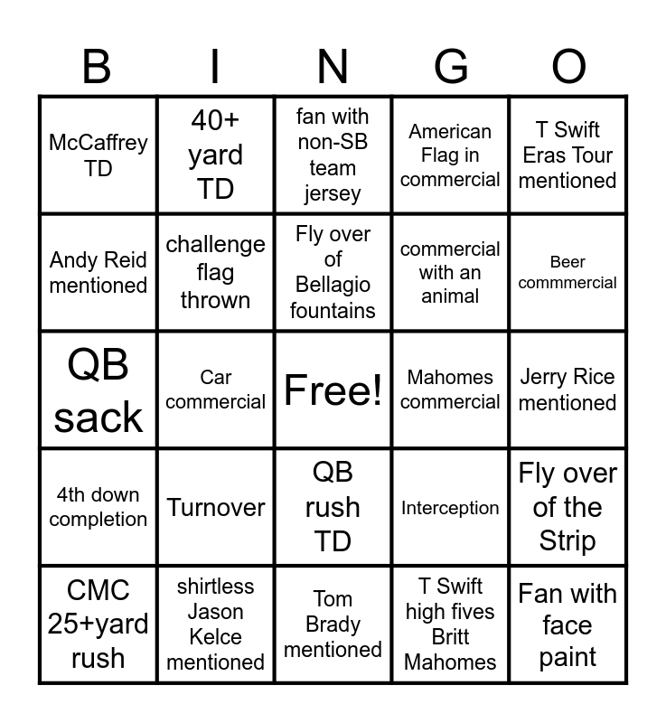 This bingo card has a free space and 34 words: missed FG/safety, T Swift high fives Britt Mahomes, Cut to T swift after Kelce play, successful 2 pt conversion, 4th down completion, challenge flag thrown, T Swift Eras Tour mentioned, CMC 25+yard rush, 40+ yard TD, Defensive TD, Fly over of Bellagio fountains, fan with non-SB team jersey, Taunting flag, Gronk commercial, Mahomes commercial, Beer commmercial, shirtless Jason Kelce mentioned, QB sack, Turnover, Interception, QB rush TD, Kelce / Mahomes TD, McCaffrey TD, Jerry Rice mentioned, Tom Brady mentioned, Fan with face paint, American Flag in commercial, Taunting penalty, commercial with an animal, Andy Reid mentioned, Purdy called "Mr. Irrelevant", Car commercial, Fly over of the Strip and 50+ yard FG attempt.