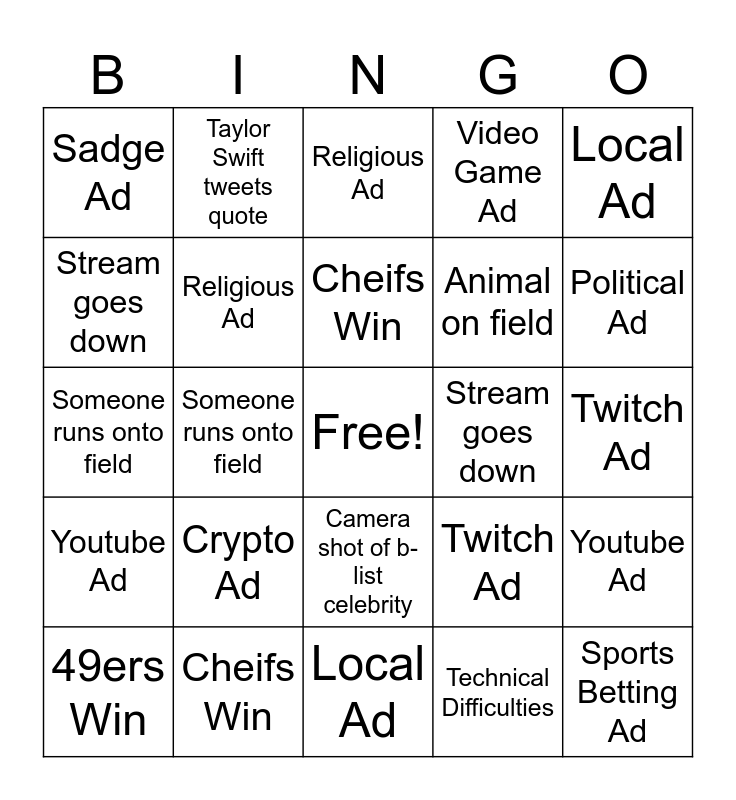 ⚠ This card has duplicate items: Taylor Swift Shot (2), Crypto Ad (2), Sports Betting Ad (2), Religious Ad (2), Twitch Ad (2), Youtube Ad (2), Cheifs Win (2), 49ers Win (2), Local Ad (2), Taylor Swift tweets quote (2), Someone runs onto field (2), Video Game Ad (2), Animal on field (2), Stream goes down (2), Political Ad (2), Sadge Ad (2)