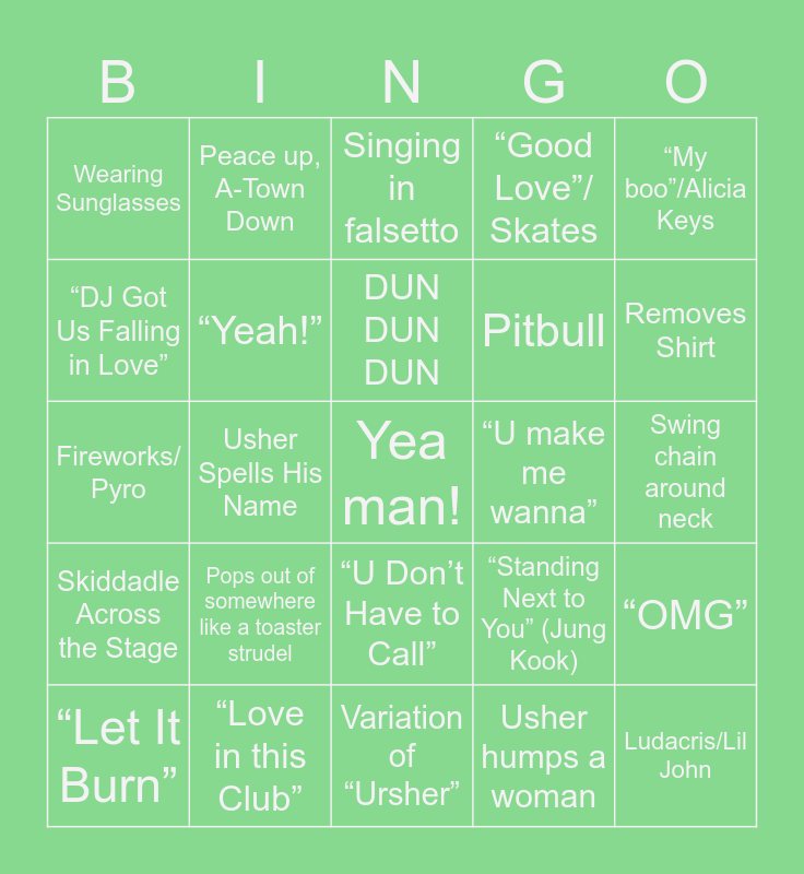 This bingo card has a free space and 24 words: “Let It Burn”, Pops out of somewhere like a toaster strudel, DUN DUN DUN, Usher humps a woman, “My boo”/Alicia Keys, Wearing Sunglasses, Peace up, A-Town Down, Singing in falsetto, “U make me wanna”, Swing chain around neck, Fireworks/ Pyro, “Yeah!”, “Standing Next to You” (Jung Kook), “OMG”, “DJ Got Us Falling in Love”, “Love in this Club”, Variation of “Ursher”, “Good Love”/ Skates, Removes Shirt, Skiddadle Across the Stage, Usher Spells His Name, “U Don’t Have to Call”, Pitbull and Ludacris/Lil John.