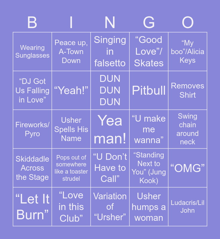 This bingo card has a free space and 24 words: “Let It Burn”, Pops out of somewhere like a toaster strudel, DUN DUN DUN, Usher humps a woman, “My boo”/Alicia Keys, Wearing Sunglasses, Peace up, A-Town Down, Singing in falsetto, “U make me wanna”, Swing chain around neck, Fireworks/ Pyro, “Yeah!”, “Standing Next to You” (Jung Kook), “OMG”, “DJ Got Us Falling in Love”, “Love in this Club”, Variation of “Ursher”, “Good Love”/ Skates, Removes Shirt, Skiddadle Across the Stage, Usher Spells His Name, “U Don’t Have to Call”, Pitbull and Ludacris/Lil John.