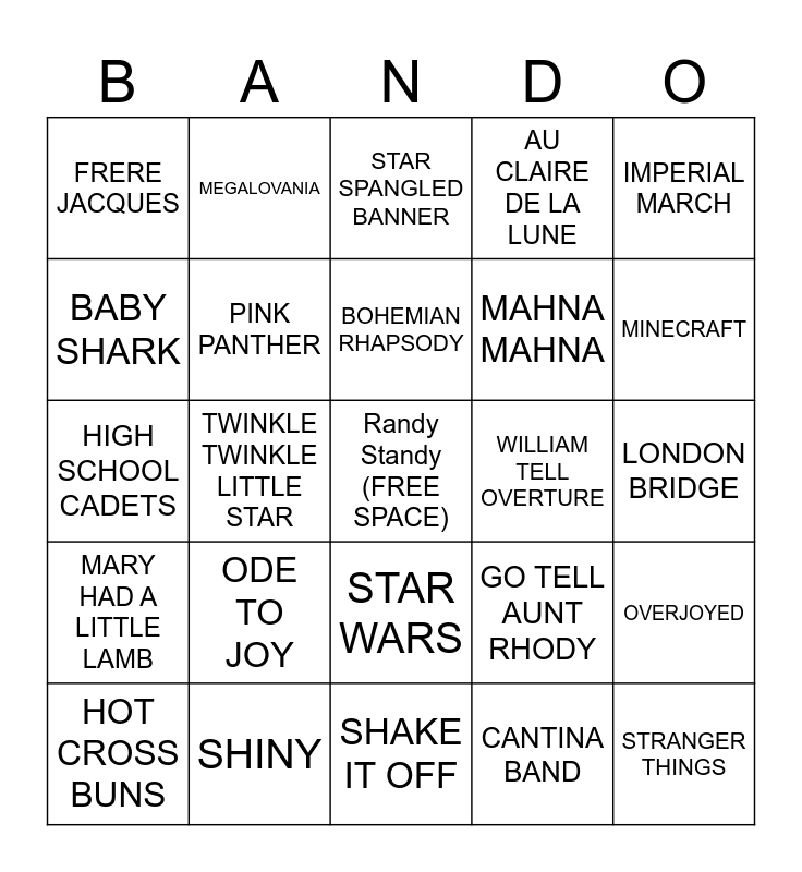This bingo card has a free space and 29 words: HOT CROSS BUNS, LIGHTLY ROW, TWINKLE TWINKLE LITTLE STAR, SWEET CAROLINE, FRERE JACQUES, STAR SPANGLED BANNER, PINK PANTHER, ODE TO JOY, WILLIAM TELL OVERTURE, SHINY, LONDON BRIDGE, STRANGER THINGS, SHAKE IT OFF, CANTINA BAND, MINECRAFT, GUARDIANS OF THE GALAXY, STAR WARS, MARY HAD A LITTLE LAMB, IMPERIAL MARCH, HIGH SCHOOL CADETS, GO TELL AUNT RHODY, STARSPLITTER FANFARE, MAHNA MAHNA, BABY SHARK, AU CLAIRE DE LA LUNE, MEGALOVANIA, OVERJOYED, BOHEMIAN RHAPSODY and EVERYTHING IS AWESOME.