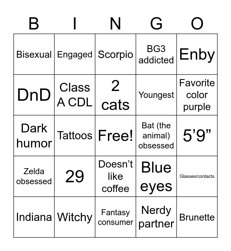 This bingo card has a free space and 24 words: 29, Witchy, 2 cats, Indiana, Enby, Bisexual, DnD, Engaged, Bat (the animal) obsessed, Doesn’t like coffee, Youngest, Dark humor, Blue eyes, Glasses/contacts, Class A CDL, Nerdy partner, 5’9”, Scorpio, Favorite color purple, Tattoos, Brunette, Zelda obsessed, BG3 addicted and Fantasy consumer.