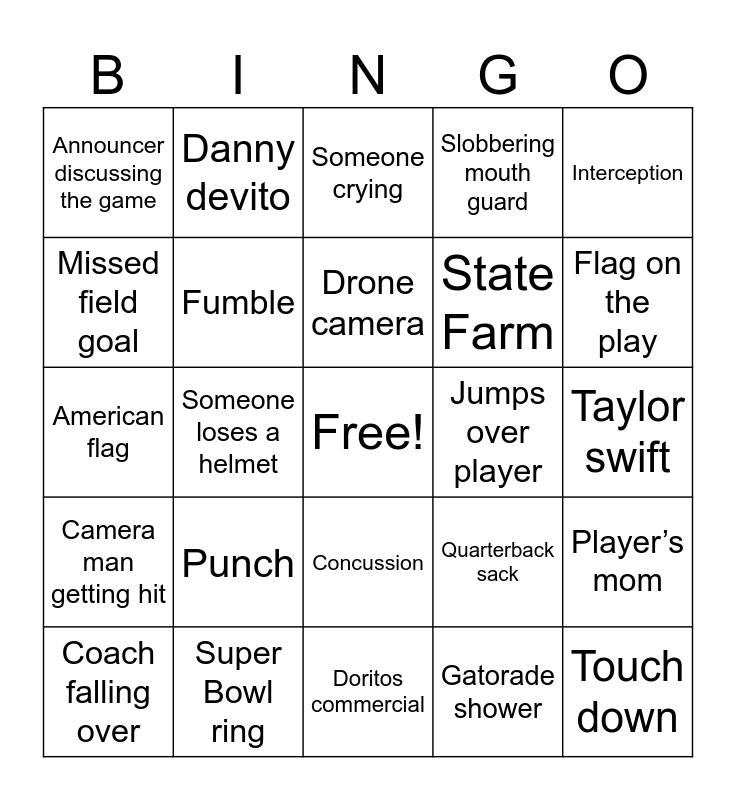 This bingo card has a free space and 39 words: Drone camera, Grass stains, Blood stains, Fumble, Coach falling over, Concussion, Drone camera, Yelling at ref, Interception, Camera man getting hit, Someone loses a helmet, Slobbering mouth guard, Touch down, Taylor swift, Jumps over player, Punch, Usher, Announcer discussing the game, Cheerleaders, Quarterback sack, Missed field goal, Doritos commercial, State Farm, Flag on the play, Overtime, 30+ combined points, Fan face paint, Instant replay, The sphere, Danny devito, Interception, Timeout, Someone crying, Super Bowl ring, Gatorade shower, Leg injury, Player’s mom, American flag and Feather boas.