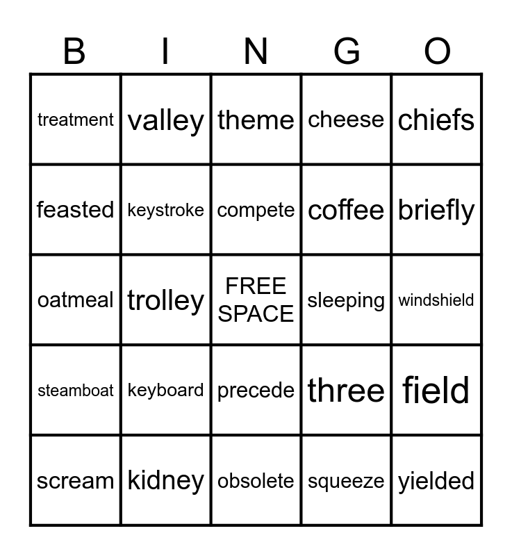 This bingo card has a free space and 49 words: clean, medley, concrete, squeeze, windshield, dreaming, valley, complete, coffee, shrieking, feasted, trolley, three, yielded, whipcream, hockey, theme, sleeping, retrieve, treatment, kidney, obsolete, cheese, chiefs, wheat, keyboard, compete, succeed, field, steamboat, volleyball, precede, kneecap, cookie, scream, chimney, Chinese, sweeten, briefly, grease, honeybee, Japanese, speechless, cashier, oatmeal, keystroke, delete, canteen and nieces.