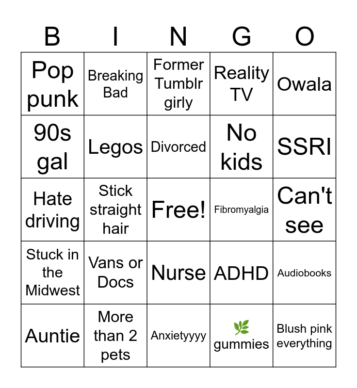 This bingo card has a free space and 24 words: Vans or Docs, More than 2 pets, Divorced, Auntie, Owala, Pop punk, 90s gal, Breaking Bad, Fibromyalgia, Nurse, No kids, Hate driving, ADHD, Audiobooks, Legos, 🌿 gummies, Can't see, Former Tumblr girly, SSRI, Stick straight hair, Blush pink everything, Stuck in the Midwest, Reality TV and Anxietyyyy.
