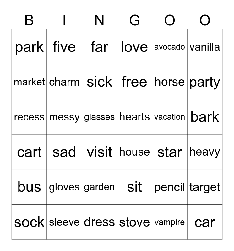This bingo card has 36 words: sit, garden, stove, market, cart, hearts, charm, dress, avocado, pencil, party, love, target, messy, free, park, bus, vacation, recess, far, glasses, sad, house, visit, star, five, horse, sleeve, sick, vanilla, car, sock, heavy, bark, gloves and vampire.