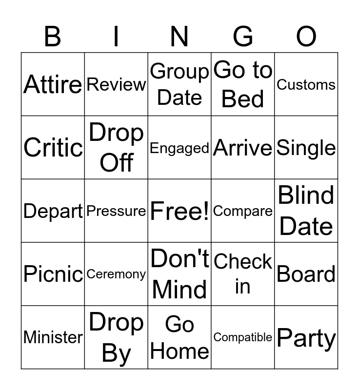This bingo card has a free space and 24 words: Ceremony, Drop By, Engaged, Minister, Customs, Attire, Critic, Review, Compare, Don't Mind, Arrive, Depart, Check in, Board, Drop Off, Compatible, Blind Date, Group Date, Single, Pressure, Party, Picnic, Go to Bed and Go Home.