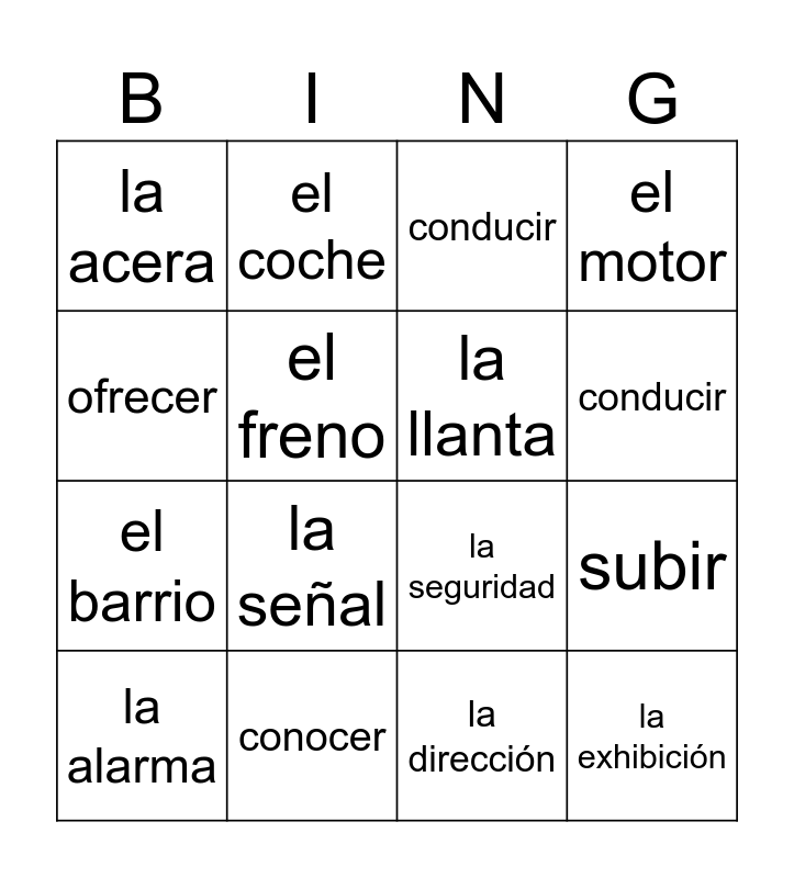 This bingo card has 51 words: Free!, la alarma, el baúl/cajuela, el capó, el cinturón de seguridad, el claxon, el coche, el faro, el freno, el limpiapara- brisas, la llanta, el motor, el parachoques, la placa, la rueda, el volante, conducir, conocer, doblar, ofrecer, subir, tirar, la acera, el barrio, el césped, la curva, la señal, el tráfico, el vecino, conducir, conocer, doblar, manejar, ofrecer, subir, tirar, saber, de cerca, la demora, deportivo/a, la dirección, la exhibición, exigente, mientras, moderno, prohibido, la seguridad, norte, sur, este and oeste.
