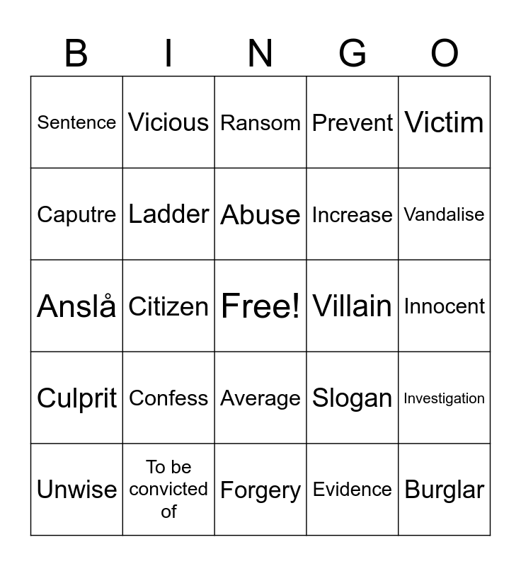 This bingo card has a free space and 24 words: Confess, To be convicted of, Abuse, Unwise, Victim, Sentence, Caputre, Vicious, Villain, Average, Increase, Anslå, Slogan, Investigation, Ladder, Evidence, Innocent, Ransom, Vandalise, Citizen, Burglar, Culprit, Prevent and Forgery.