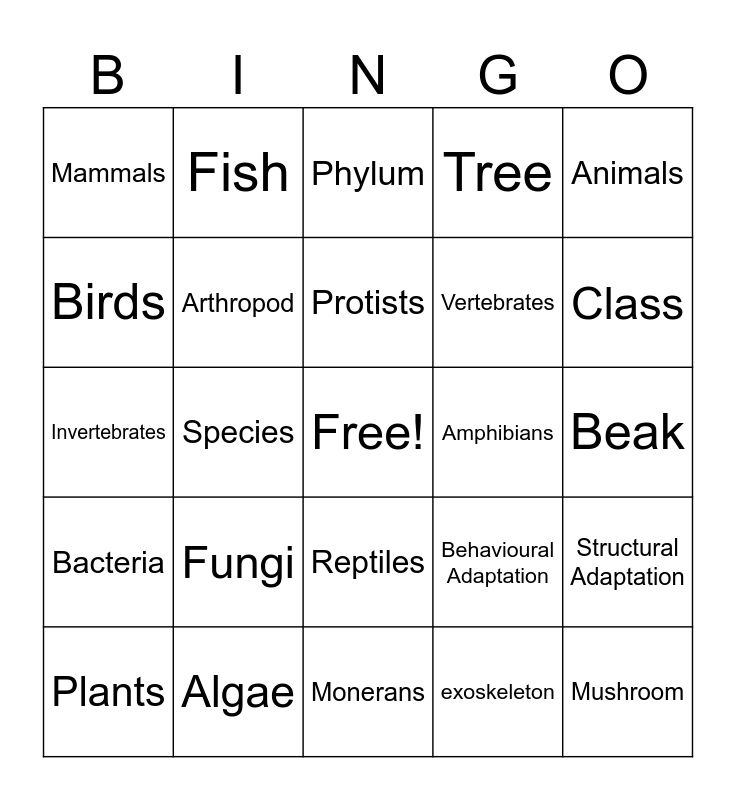 This bingo card has a free space and 25 words: Fungi, Monerans, Protists, Plants, Animals, Mammals, Birds, Fish, Amphibians, Reptiles, Vertebrates, Invertebrates, Behavioural Adaptation, Structural Adaptation, Arthropod, Gills, Beak, Phylum, Class, Species, Mushroom, Algae, Bacteria, Tree and exoskeleton.