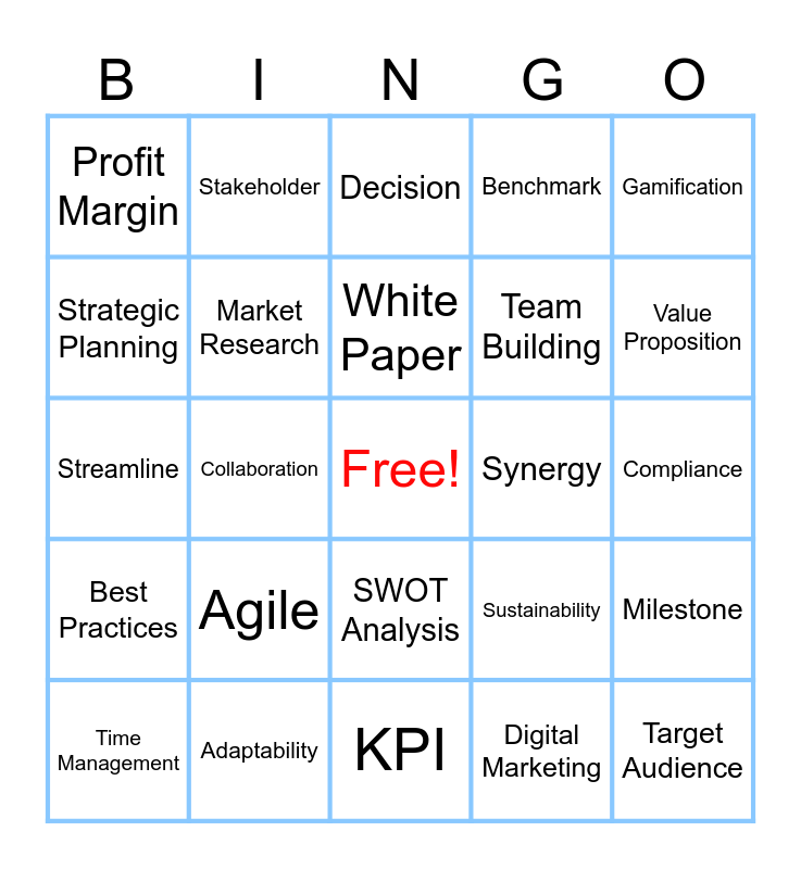 This bingo card has a free space and 24 words: Agile, Adaptability, White Paper, Time Management, Gamification, Profit Margin, Strategic Planning, Stakeholder, Synergy, SWOT Analysis, Team Building, Streamline, Sustainability, Milestone, Market Research, Digital Marketing, Compliance, Decision, Value Proposition, Collaboration, Target Audience, Best Practices, Benchmark and KPI.