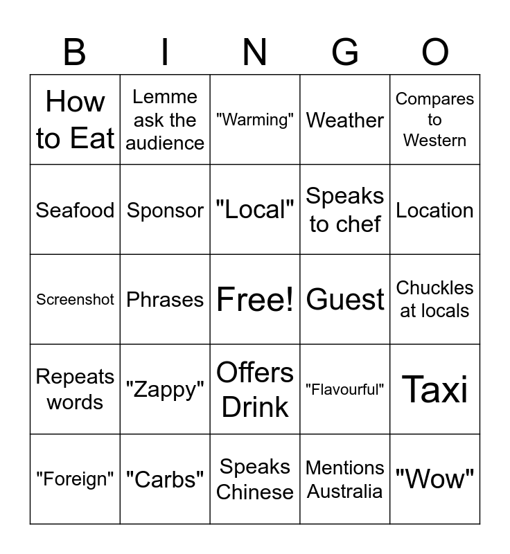 This bingo card has a free space and 24 words: "Foreign", "Zappy", "Local", Mentions Australia, Compares to Western, How to Eat, Lemme ask the audience, "Warming", Guest, Chuckles at locals, Screenshot, Sponsor, "Flavourful", Taxi, Seafood, "Carbs", Speaks Chinese, Weather, Location, Repeats words, Phrases, Offers Drink, Speaks to chef and "Wow".
