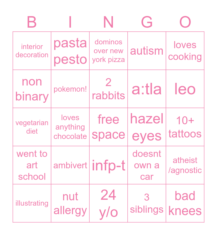 This bingo card has a free space and 24 words: ambivert, nut allergy, 2 rabbits, illustrating, loves cooking, interior decoration, non binary, pasta pesto, hazel eyes, infp-t, a:tla, vegetarian diet, doesnt own a car, atheist /agnostic, pokemon!, 3 siblings, 10+ tattoos, dominos over new york pizza, leo, loves anything chocolate, bad knees, went to art school, autism and 24 y/o.
