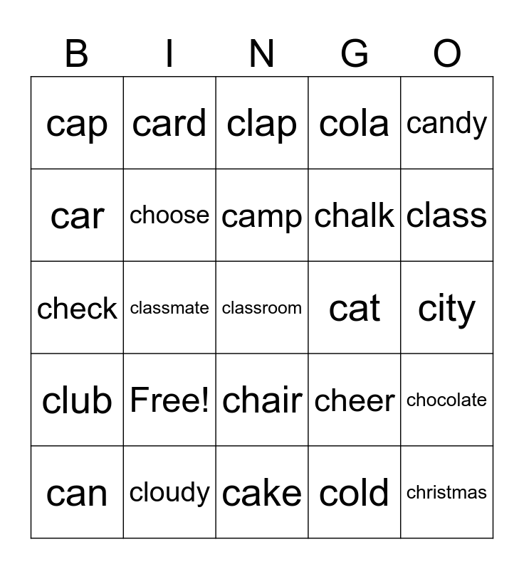 This bingo card has 25 words: Free!, cake, camp, can, candy, cap, car, card, cat, chair, chalk, check, cheer, chocolate, choose, christmas, city, clap, class, classmate, classroom, cloudy, club, cola and cold.