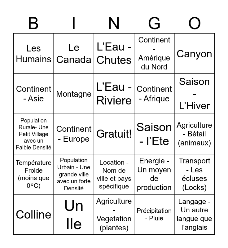 This bingo card has a free space and 34 words: Précipitation - Neige, Précipitation - Pluie, Précipitation - Aucune: Ensoleillé, Température Chaud (plus que 25॰C), Température Froide (moins que 0॰C), Montagne, Canyon, Colline, Le Canada, Vegetation - Foret, L’Eau - Riviere, L’Eau - Chutes, L’Eau - Ocean, L’Eau - Lac, Saison - l’Ete, Saison - L’Hiver, Un Ile, Population Rurale- Une Petit Village avec un Faible Densité, Population Urbain - Une grande ville avec un forte Densité, Energie - Un moyen de production, Location - Nom de ville et pays spécifique, Province/Territoire Canadienne, Les Humains, Agriculture - Bétail (animaux), Agriculture - Vegetation (plantes), Langage - Un autre langue que l’anglais, Continent - Amérique du Nord, Continent - Amérique du Sud, Continent - Afrique, Continent - Asie, Continent - Oceanie, Continent - Europe, Transport - Les écluses (Locks) and Pétrole - Une machine qui fonctionne grace au petrole.