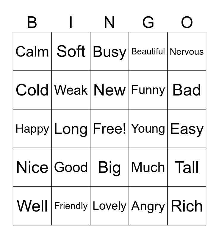 This bingo card has a free space and 25 words: Good, Lovely, New, Well, Nervous, Calm, Cold, Soft, Young, Big, Funny, Happy, Much, Tall, Weak, Little, Easy, Busy, Bad, Long, Rich, Friendly, Nice, Beautiful and Angry.
