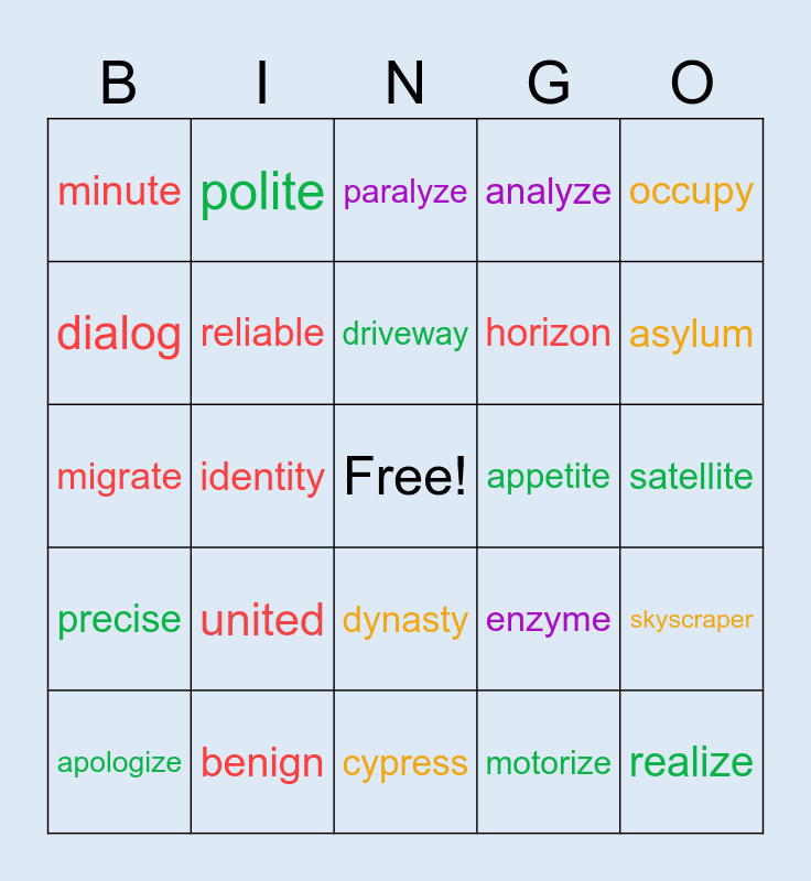 This bingo card has a free space and 24 words: united, benign, driveway, apologize, occupy, minute, dialog, polite, appetite, dynasty, horizon, migrate, enzyme, skyscraper, reliable, motorize, satellite, paralyze, asylum, identity, realize, precise, analyze and cypress.