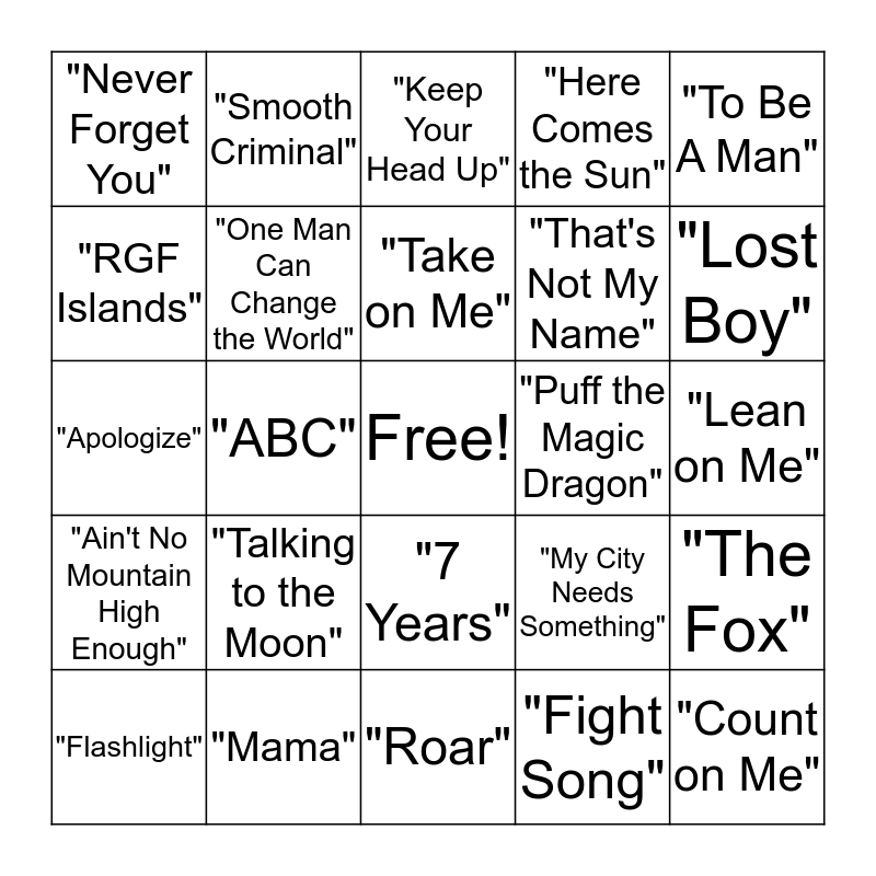 This bingo card has a free space and 24 words: "Talking to the Moon", "Mama", "Take on Me", "Flashlight", "To Be A Man", "Never Forget You", "RGF Islands", "Smooth Criminal", "Puff the Magic Dragon", "7 Years", "That's Not My Name", "Apologize", "My City Needs Something", "The Fox", "One Man Can Change the World", "Fight Song", "Lean on Me", "Keep Your Head Up", "Lost Boy", "ABC", "Count on Me", "Ain't No Mountain High Enough", "Here Comes the Sun" and "Roar".