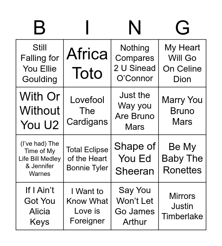 This bingo card has 61 words: Free!, Love Story Taylor Swift, Lover Taylor Swift, Mirrors Justin Timberlake, Love on the Brain Rihanna, Senorita Camilla Cabello & Shawn Mendes, Just the Way you Are Bruno Mars, I Will Always Love You Whitney Houston, (I’ve had) The Time of My Life Bill Medley & Jennifer Warnes, Can You Feel the Love Tonight Elton John, My Heart Will Go On Celine Dion, I Don’t Wanna Miss a Thing Aerosmith, Lovefool The Cardigans, Bleedin Love Leona Lewis, Careless Whisper George Michael, Still Falling for You Ellie Goulding, If I Ain’t Got You Alicia Keys, With Or Without You U2, All of Me John Legend, Marry You Bruno Mars, I Want to Know What Love is Foreigner, Nothing Compares 2 U Sinead O’Connor, She’s The One Robbie Williams, Ghost Justin Bieber, Perfect Ed Sheran, Endless Love Lionel Richie, Every Breath You Take The Police, Rewrite the Stars Zac Efron & Zendaya, Total Eclipse of the Heart Bonnie Tyler, Accidentally in Love Counting Crows, You’re the First, the Last, My Everything Barry White, True Colors Cyndi Lauper, Last Request Paolo Nutini, I’m a Believer Smash Mouth, Africa Toto, Shallow Lady Gaga & Bradley Cooper, Teenage Dream Katy Perry, Be My Baby The Ronettes, What’s Love Got To Do with It Tina Turner, Shape of You Ed Sheeran, Thinking Out Loud Ed Sheeran, I’m Yours Jason Mraz, Say You Won’t Let Go James Arthur, Love Me Like You Do Ellie Goulding, Tennessee Whiskey Chris Stapleton, Let it Go James Bay, The Best Tina Turner, You Can’t Hurry Love Phil Collins, Baby Justin Bieber, Die For You The Weekend, Fallin' Alicia Keys, Chasing Cars Snow Patrol, Can’t Help Falling in Love Elvis Presley, Time After Time Cyndi Lauper, Beautiful Bazzi, Paradise Bazzi, Valerie Amy Winehouse, Adore You Harry Styles, Treasure Bruno Mars, Marry You Bruno Mars and Stand By Me Ben E. King.