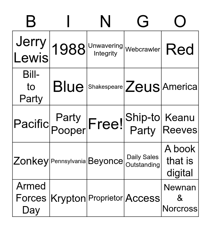 This bingo card has a free space and 24 words: Pennsylvania, Krypton, Shakespeare, Armed Forces Day, Red, Jerry Lewis, Bill-to Party, 1988, Ship-to Party, Beyonce, Zeus, Pacific, Daily Sales Outstanding, A book that is digital, Blue, Access, Keanu Reeves, Unwavering Integrity, America, Party Pooper, Newnan & Norcross, Zonkey, Webcrawler and Proprietor.