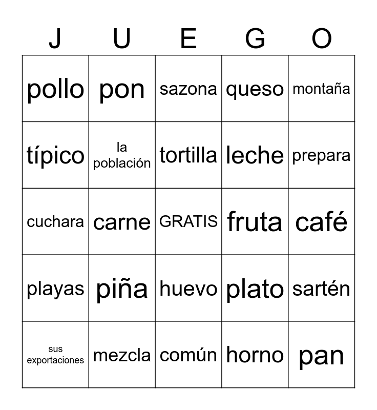This bingo card has a free space and 39 words: salchicha, se come, la capital, la población, sus exportaciones, huevo, tortilla, parque nacional, montaña, playas, carne, queso, pan, café, fruta, piña, jugo, pollo, frijoles, plato, típico, común, leche, prepara, corta, cocina, agrega, añade, toma, pon, echa, revuelve, sazona, mezcla, horno, estufa, sartén, cuchara and aguacate.