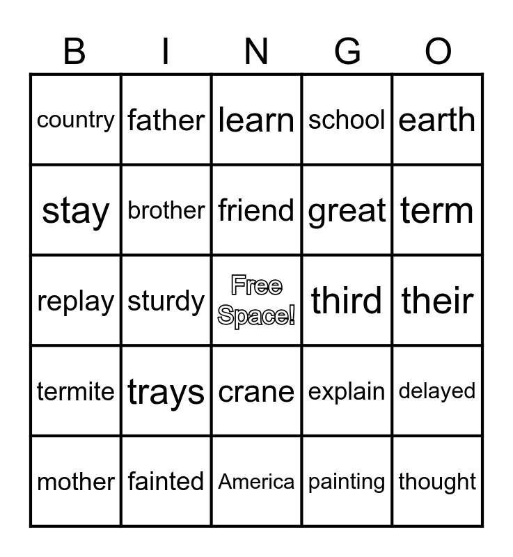 This bingo card has a free space and 33 words: dirty, chapter, sturdy, corner, termite, brother, earth, mother, father, our, friend, learn, church, cursive, third, term, fainted, replay, trays, explain, crane, away, country, their, America, thought, school, great, stay, delayed, rain, painting and mermaid.
