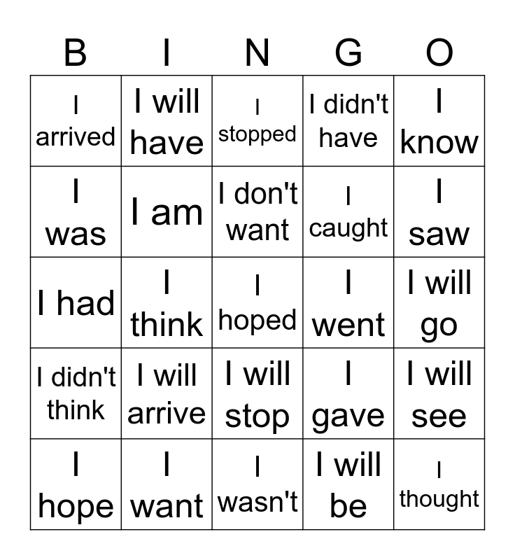 This bingo card has a free space and 24 words: I will arrive, I want, I don't want, I hope, I know, I arrived, I was, I will have, I went, I will stop, I caught, I had, I gave, I will see, I am, I will be, I will go, I stopped, I saw, I think, I thought, I didn't think, I didn't have and I wasn't.