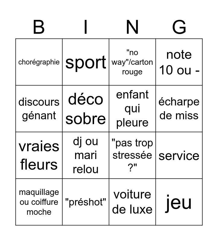 This bingo card has 16 words: "préshot", service, "no way"/carton rouge, chorégraphie, vraies fleurs, sport, "pas trop stressée ?", voiture de luxe, discours génant, déco sobre, maquillage ou coiffure moche, note 10 ou -, dj ou mari relou, écharpe de miss, enfant qui pleure and jeu.