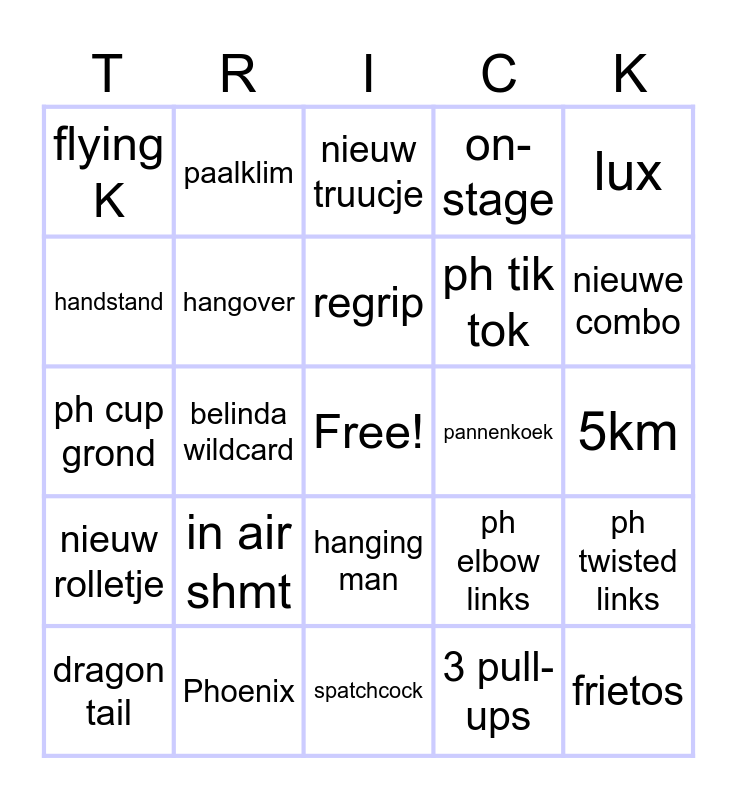 This bingo card has a free space and 24 words: in air shmt, Phoenix, regrip, dragon tail, lux, flying K, handstand, paalklim, pannenkoek, hanging man, ph tik tok, ph cup grond, ph elbow links, ph twisted links, hangover, 3 pull-ups, 5km, nieuw truucje, nieuwe combo, belinda wildcard, frietos, nieuw rolletje, on-stage and spatchcock.