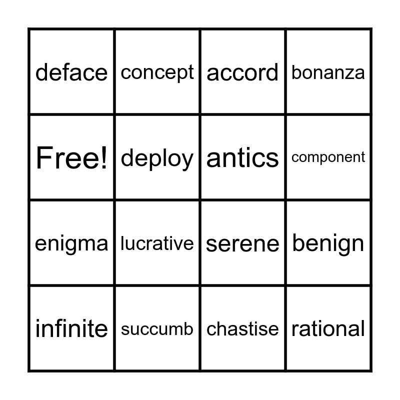 This bingo card has 16 words: succumb, benign, accord, deface, enigma, concept, serene, chastise, Free!, deploy, infinite, bonanza, lucrative, component, antics and rational.