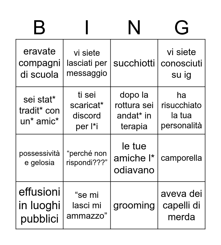 This bingo card has 16 words: “se mi lasci mi ammazzo”, camporella, succhiotti, eravate compagni di scuola, possessività e gelosia, vi siete lasciati per messaggio, le tue amiche l* odiavano, grooming, sei stat* tradit* con un* amic*, ti sei scaricat* discord per l*i, effusioni in luoghi pubblici, vi siete conosciuti su ig, “perché non rispondi???”, ha risucchiato la tua personalità, dopo la rottura sei andat* in terapia and aveva dei capelli di merda.