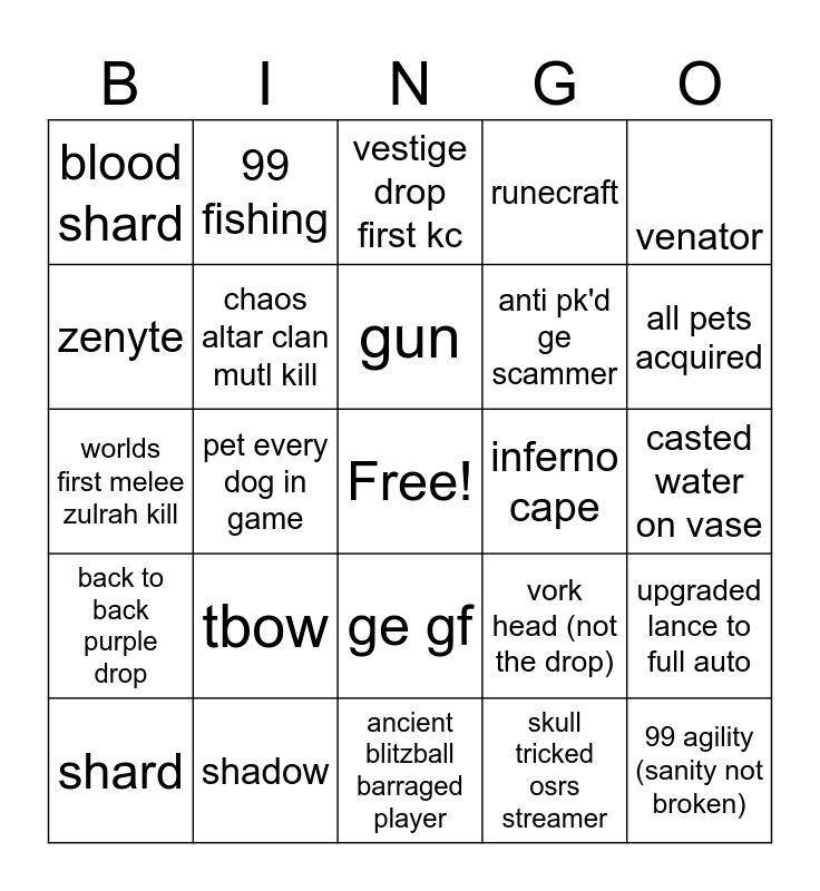 This bingo card has a free space and 24 words: tbow, shadow, gun, shard, venator, blood shard, zenyte, 99 fishing, inferno cape, ge gf, anti pk'd ge scammer, worlds first melee zulrah kill, vork head (not the drop), upgraded lance to full auto, chaos altar clan mutl kill, skull tricked osrs streamer, casted water on vase, vestige drop first kc, all pets acquired, pet every dog in game, 99 agility (sanity not broken), back to back purple drop, runecraft and ancient blitzball barraged player.
