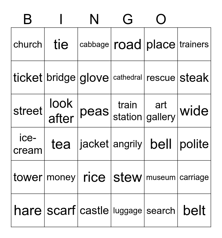 This bingo card has 36 words: stew, rice, luggage, ticket, ice-cream, train station, bridge, castle, place, museum, steak, road, carriage, look after, cathedral, church, tower, art gallery, street, cabbage, peas, tea, angrily, jacket, bell, tie, rescue, scarf, glove, trainers, belt, hare, polite, wide, money and search.