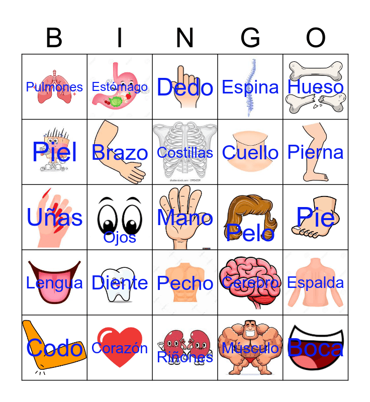 This bingo card has 30 images and 30 words: Corazón, Nariz, Ojos, Cabeza, Pulmones, Dedo, Brazo, Pecho, Pelo, Riñones, Pie, Mano, Músculo, Boca, Pierna, Rodilla, Cerebro, Lengua, Diente, Hueso, Uñas, Tobillo, Estómago, Cuello, Piel, Espina, Espalda, Codo, Costillas and Labios.