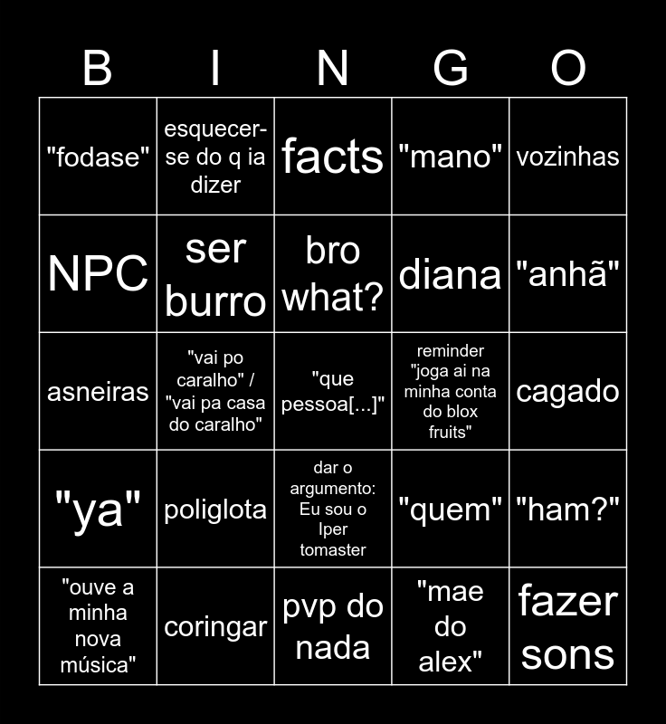 This bingo card has 35 words: cantar, comer, ofender, ser burro, dar o argumento: Eu sou o Iper tomaster, "mano", NPC, lag, bro what?, random, asneiras, vozinhas, futebol, esquizofrenico, "fodase", reminder "joga ai na minha conta do blox fruits", "mae do alex", "vai po caralho" / "vai pa casa do caralho", "ya", "que pessoa[...]", "quem", "ouve a minha nova música", "ham?", coringar, facts, "anhã", fazer sons, AFK, diana, cagado, susto / aqle barulho qnd ta a fugir, pvp do nada, poliglota, esquecer-se do q ia dizer and tossir.