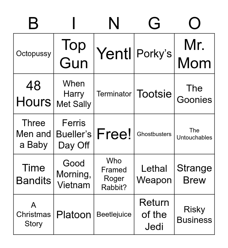 This bingo card has a free space and 61 words: Raiders of the Lost Ark, Platoon, Superman II, Time Bandits, Return of the Jedi, The Princess Bride, When Harry Met Sally, ET, Tootsie, Rocky III, Porky’s, Star Trek 2: The Wrath of Khan, 48 Hours, Poltergeist, Annie, Octopussy, Risky Business, Mr. Mom, Staying Alive, Terminator, Ghostbusters, Yentl, A Christmas Story, Strange Brew, Indiana Jones & the Temple of Doom, Beverly Hills Cop, This is Spinal Tap, Rocky IV, The Goonies, The Color Purple, Witness, First Blood, National Lampoon’s Vacation, Pee-Wee’s Big Adventure, Top Gun, Crocodile Dundee, Back to School, Ferris Bueller’s Day Off, Transformers: The Movie, Three Men and a Baby, Fatal Attraction, Good Morning, Vietnam, The Untouchables, Moonstruck, Lethal Weapon, Die Hard, Rain Man, Coming to America, Twins, Who Framed Roger Rabbit?, Beetlejuice, A Nightmare on Elm Street, Friday the 13th, Batman, The Little Mermaid, Gremlins, The Karate Kid, Back to the Future, Footloose, Amadeus and Glory.