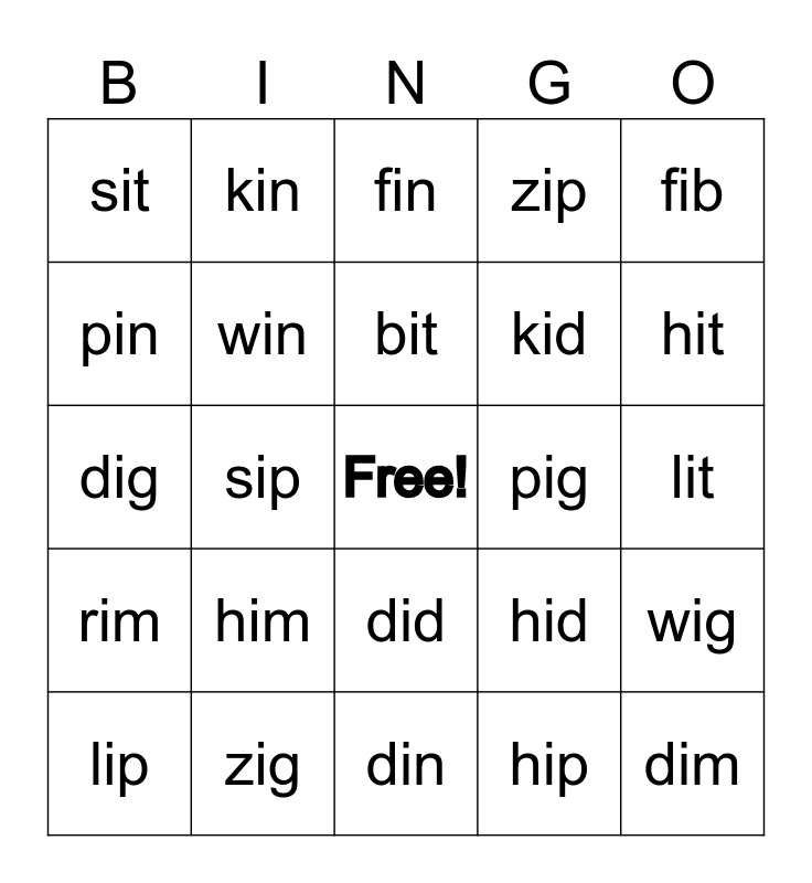 This bingo card has a free space and 27 words: hid, rid, kid, din, pin, fin, kin, rim, pig, wig, dig, zip, lip, zig, hit, big, win, bit, him, sit, lit, hip, sip, dim, did, fib and Jim.