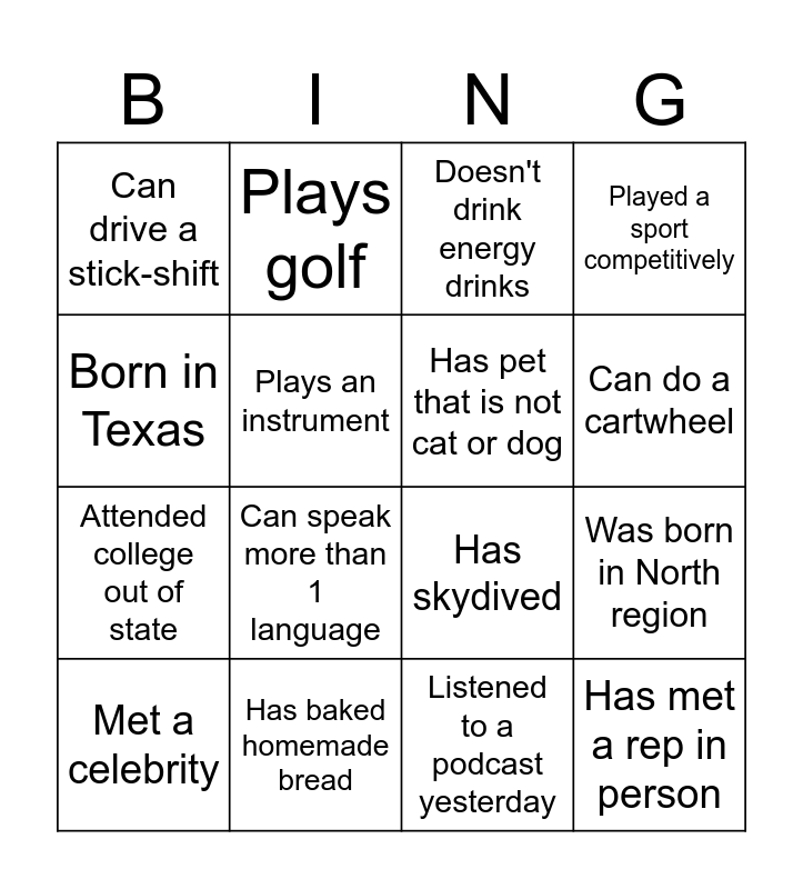 This bingo card has 16 words: Has baked homemade bread, Was born in North region, Doesn't drink energy drinks, Can drive a stick-shift, Attended college out of state, Plays golf, Has skydived, Listened to a podcast yesterday, Born in Texas, Plays an instrument, Met a celebrity, Played a sport competitively, Can speak more than 1 language, Can do a cartwheel, Has pet that is not cat or dog and Has met a rep in person.